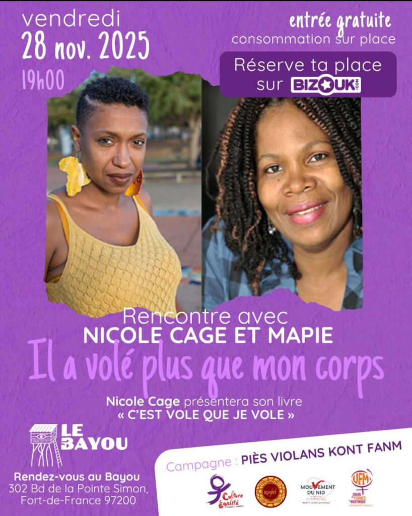 Rencontre avec NICOLE CAGE ET MAPIE : Campagne : PIÈS VIOLANS KONT FANM Nicole Cage présentera son livre « C’EST VOLE QUE JE VOLE »