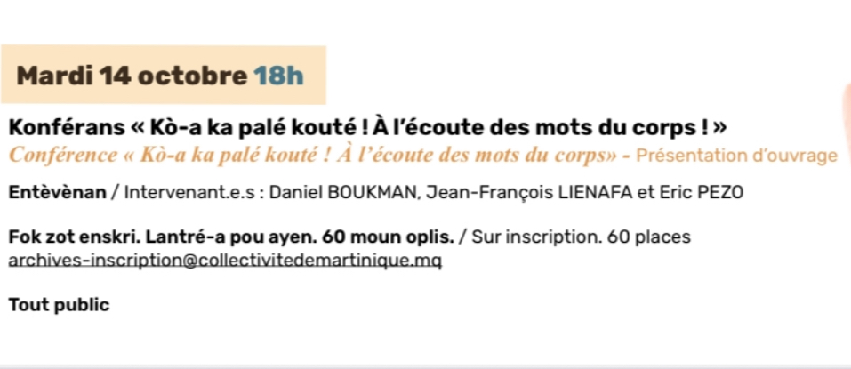 À l’écoute des mots du corps Présentation d’ouvrage * Entevenan / Intervenant.e.s : Daniel BOUKMAN, Jean-François LIENAFA et Eric PEZO * Fok zot enskri.
