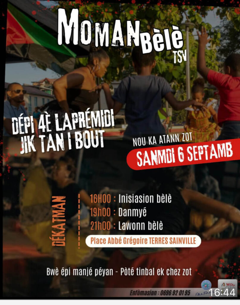 DÉPI 4È LAPRÉMIDI JIK TAN I BOUT, NOU KA ATANN ZOT « DEKATMAN » 16H00 : Inisiasion bèlè 19h00 : Danmyé 21h00 : Lawonn bèlè